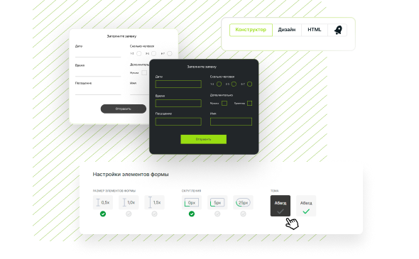 Выбирайте одну из тем оформления и задавайте параметры скругления полей, цвета кнопок и расположения элементов. Настраивайте рамки, цвет, фон и другие параметры в соответствии с фирменным стилем сайта
