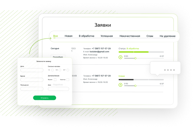 Обрабатывайте заявки внутри QForm, распределяя права доступа между менеджерами. Сортируйте обращения по статусу выполнения, источникам, формам и другим параметрам