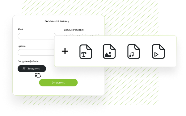 Создавайте формы с возможностью загрузки текстовых файлов, музыки, изображений, видео. Работайте с файлами клиентов внутри QForm или пересылайте их в удобное место