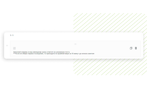 Добавьте и настройте типы полей: Разместите «Текстовый блок». Поле поддерживает теги HTML, используя которые можно добавлять элементы и задавать стили внутри тегов. В нашем случае это заголовок и полезная информация для клиента