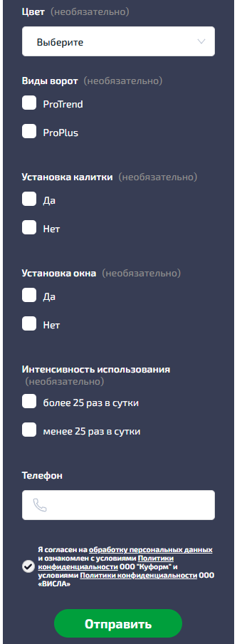 Это не онлайн-калькулятор, а простая форма, где клиент выбирает нужные характеристики: размеры, тип материала, дополнительные опции - и отправляет их менеджеру для точного расчёта.
