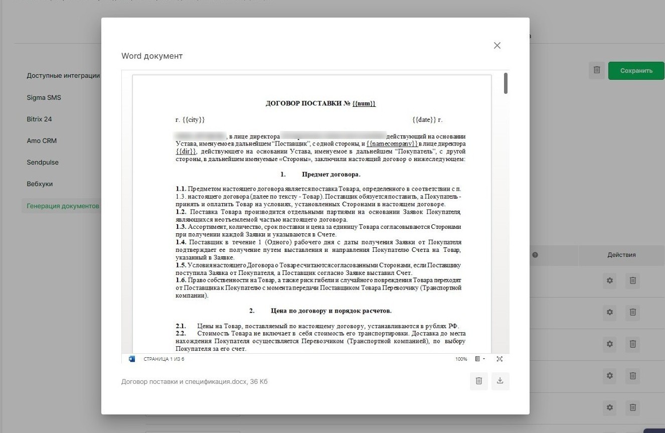 Автоматизированное создание счетов, договоров и актов на основе данных из форм. Загрузите шаблон документа и настройте логику заполнения специальными метками