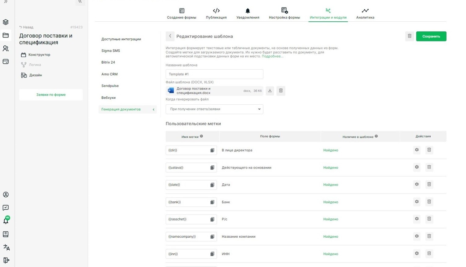 Загрузите шаблон и настройте соответствие меток полям формы