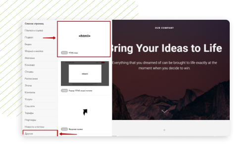 В списке блоков спуститесь к разделу «Другое» и выберите «HTML-код»