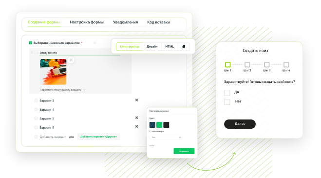 Сервис квизов для сайта Qform создает интерактивную форму под любые ваши запросы. Квиз — это удобный веб-инструмент, который помогает вовлекать аудиторию во взаимодействие, определяться с выбором и изучать их потребности. Посетитель отвечает на вопросы и оставляет заявку с входными данными