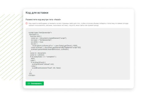 Перейдите во вкладку «Настройки», откройте раздел «Код вставки», скопируйте скрипт и вставьте на сайт внутри тега "head"Б