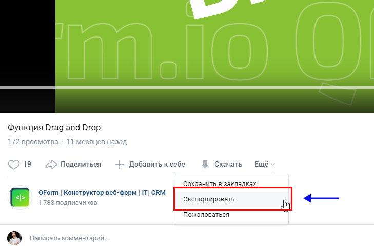 Шаг 1. Откройте страницу с нужным видео ВКонтакте. Под видеоплеером нажмите ссылку «Еще» и выберите пункт «Экспортировать».