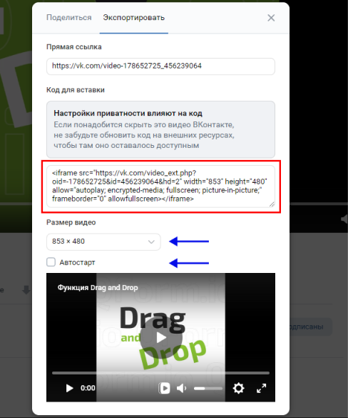 Шаг 2. В появившемся окне скопируйте HTML-код с тегом iframe. Здесь же можно сразу выбрать размер окна (из предложенных вариантов или указать вручную) и включить автозапуск видео (по умолчанию видео не воспроизводится автоматически и стартует только по клику). Скопируйте получившийся iframeкод.